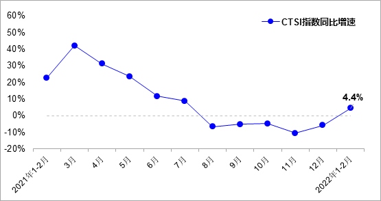 數(shù)據(jù)顯示,2022年1-2月,中國(guó)運(yùn)輸生產(chǎn)指數(shù)(CTSI)均值為153.8點(diǎn),同比增長(zhǎng)4.4%。分結(jié)構(gòu)看,CTSI貨運(yùn)指數(shù)均值為188.2點(diǎn),同比增長(zhǎng)4.1%;CTSI客運(yùn)指數(shù)均值為83.8點(diǎn),同比增長(zhǎng)4.7%。