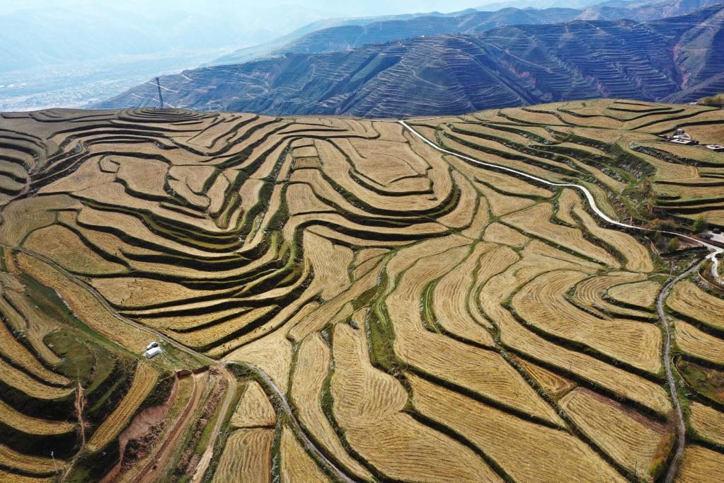 這是10月19日拍攝的青海省黃南藏族自治州同仁市黃乃亥鄉(xiāng)日秀瑪村的燕麥田(無人機(jī)照片)。新華社記者 陳杰 攝