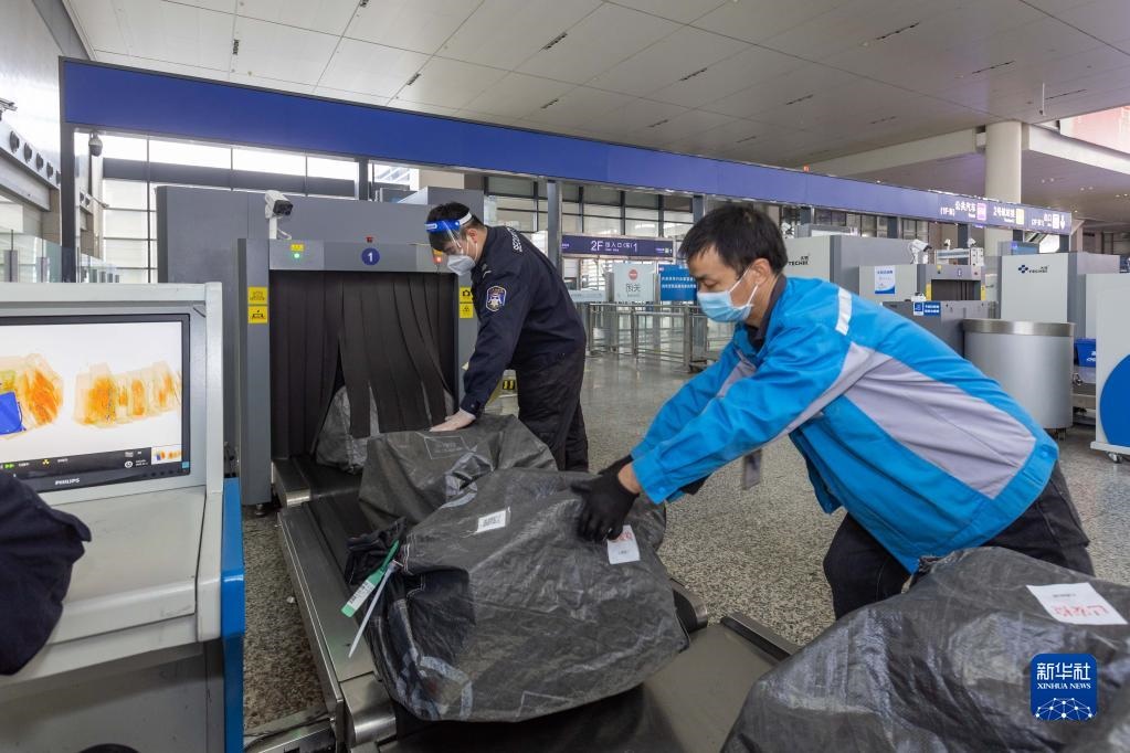 11月1日,在上海虹橋站內貨物專用安檢口,鐵路工作人員搬運通過安檢的貨物。新華社記者 王翔 攝