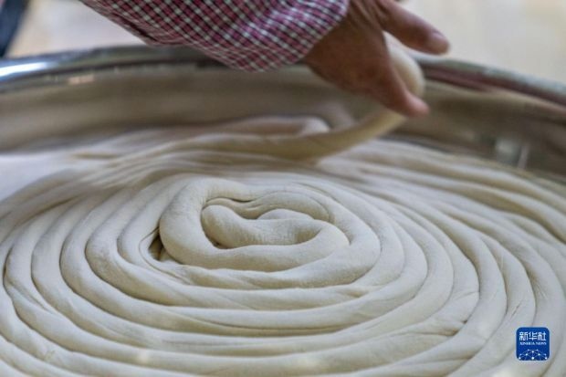12月12日,在竹塘社區(qū)掛面合作社的掛面車間,工人將搓好的面放入醒面盆。新華社發(fā)(阮雪楓 攝)