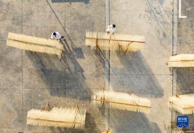 12月12日,在竹塘社區(qū)掛面合作社的掛面車間,工人在將掛面上架晾曬(無人機(jī)照片)。新華社發(fā)(阮雪楓 攝)