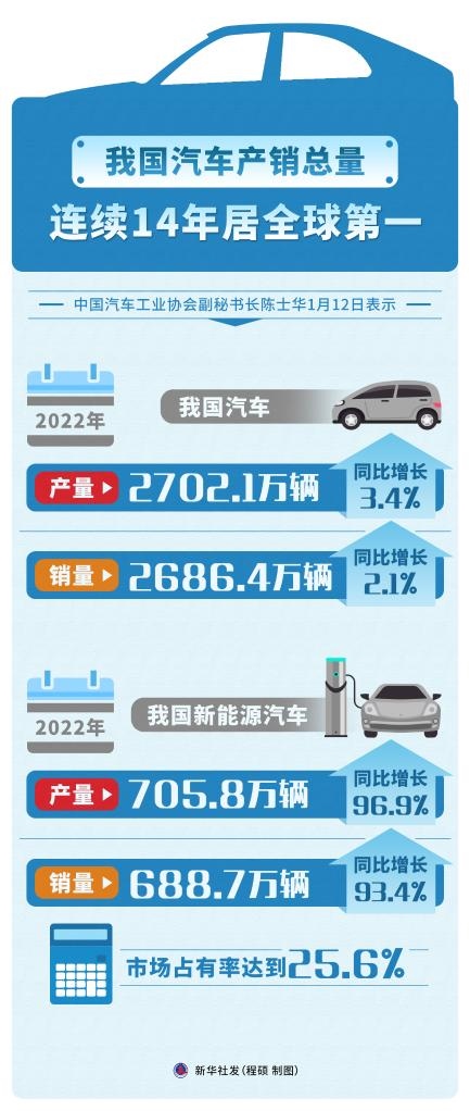 中國汽車工業(yè)協(xié)會副秘書長陳士華在12日舉行的中國汽車工業(yè)協(xié)會月度信息發(fā)布會上表示,2022年,我國汽車產(chǎn)銷分別完成2702.1萬輛和2686.4萬輛,同比增長3.4%和2.1%,全年實現(xiàn)小幅增長。我國汽車產(chǎn)銷總量已連續(xù)14年居全球第一。