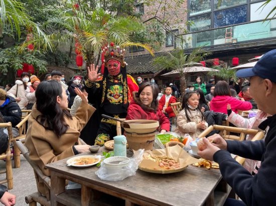 春節(jié)期間,重慶市渝中區(qū)山城巷中,“山城壩壩”茶館的院壩內(nèi)坐滿了客人。人們一邊圍爐煮茶,一邊欣賞臺上的傳統(tǒng)藝術(shù)表演,川劇變臉演員剎那間切換臉譜,贏得滿堂喝彩。老板舒蓉熱情招呼著客人,將茶水、點心端到桌上,忙得不亦樂乎?!敖衲甏汗?jié)的客流量遠超預期,營業(yè)額是去年同期的七八倍?!?/p>