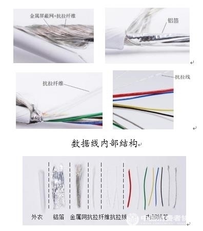 數據線接口類型多樣,內部線芯數量、線芯直徑等會因用途差異而有所不同。內部結構主要由電力傳輸線和數據傳輸線構成,外部包裹數據線外衣(例如TPE)。一般來說,內部線芯中,紅色線為供電正極,黑