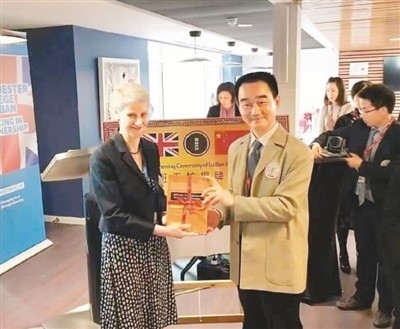 呂景泉(前右)向合作開設(shè)英國魯班工坊的英方學(xué)校代表贈送中方研發(fā)出版的教材。