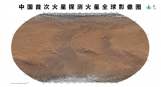 天問一號(hào)任務(wù)環(huán)繞器中分辨率相機(jī),于2021年11月至2022年7月歷時(shí)8個(gè)月,實(shí)施了284軌次遙感成像,對(duì)火星表面實(shí)現(xiàn)了全球覆蓋。地面應(yīng)用系統(tǒng)對(duì)獲取的14757幅影像數(shù)據(jù)進(jìn)行處理后得到火星全球彩色影像圖。