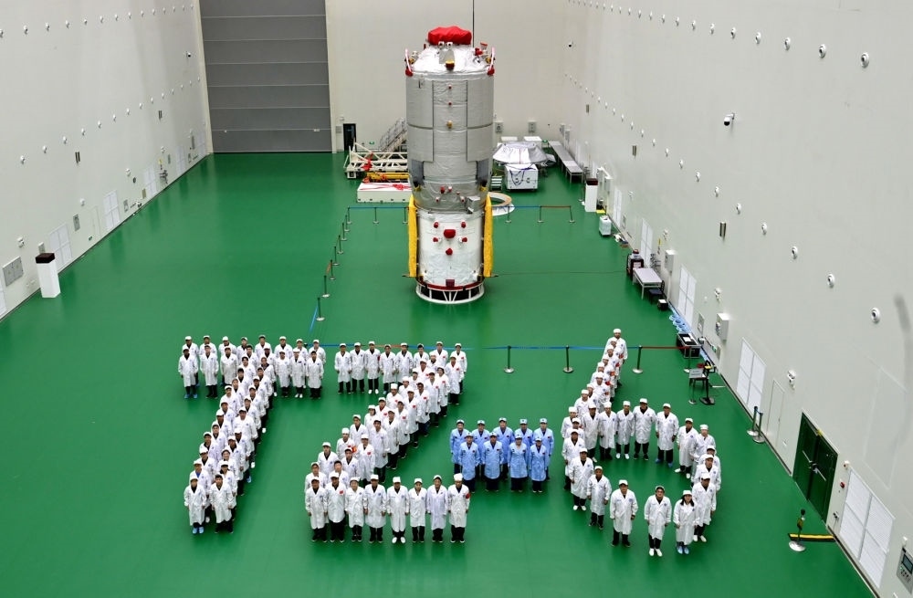 天舟六號(hào)貨運(yùn)飛船八院試驗(yàn)隊(duì)和天舟六號(hào)推進(jìn)艙合影。(中國(guó)航天科技集團(tuán)八院供圖)