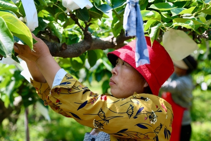 附近村民在梨園里實現(xiàn)就業(yè)。初夏時節(jié),村民給剛長出的小梨“穿衣裳”。
