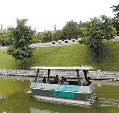游客在西安護(hù)城河乘坐自動駕駛游船游覽。 本報(bào)記者 原韜雄攝
