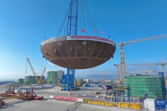 5月29日,在浙江省臺州市三門縣,三門核電二期工程4號機組核島鋼制安全殼底封頭順利吊裝就位。這是4號機組核島反應堆廠房吊裝的首個大型模塊,標志著該廠房主體結構施工開始。三門核電二期工程4號機組于3月22日開工,整個二期工程建成投產后,一、二期裝機總容量將達到500萬千瓦,年發(fā)電量預計可達到400億千瓦時。
