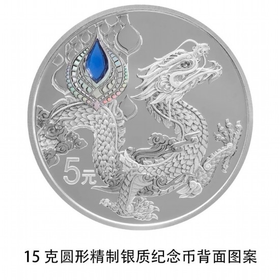 15克圓形銀質(zhì)紀念幣背面圖案為龍造型,并刊面額。