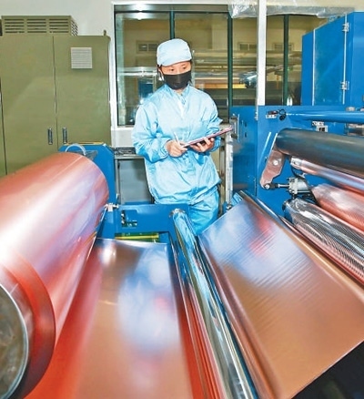 工人在銅陵有色銅冠銅箔有限公司車間內(nèi)工作。高凌君攝