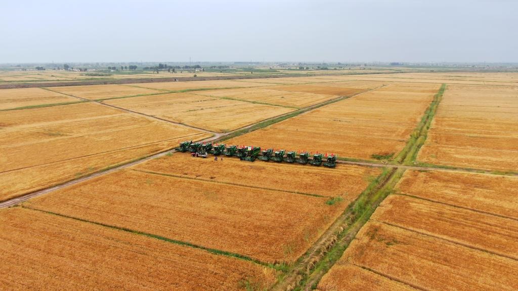 后旗蒙海鎮(zhèn)紅建村萬畝小麥連片示范創(chuàng)意園內(nèi)聯(lián)合收割機(jī)準(zhǔn)備收割小麥。新華社記者侯維軼 攝