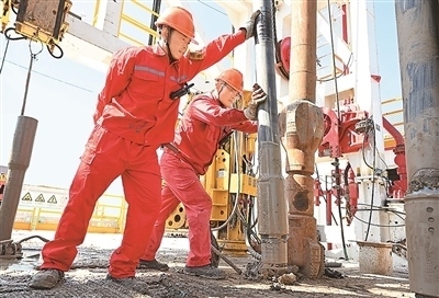 在山東省東營市勝利油田利斜856鉆井現(xiàn)場,勝利石油工程公司渤海50691鉆井隊員工進行起下鉆施工,加快石油勘探開發(fā)步伐。王國章攝(人民視覺)