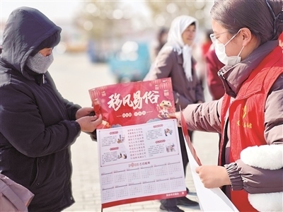 圖為寧夏鹽池縣青年志愿者給鄉(xiāng)親們發(fā)放移風易俗宣傳單。