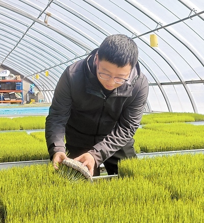 馬巍查看秧苗在生物質育苗基質上的生長情況。