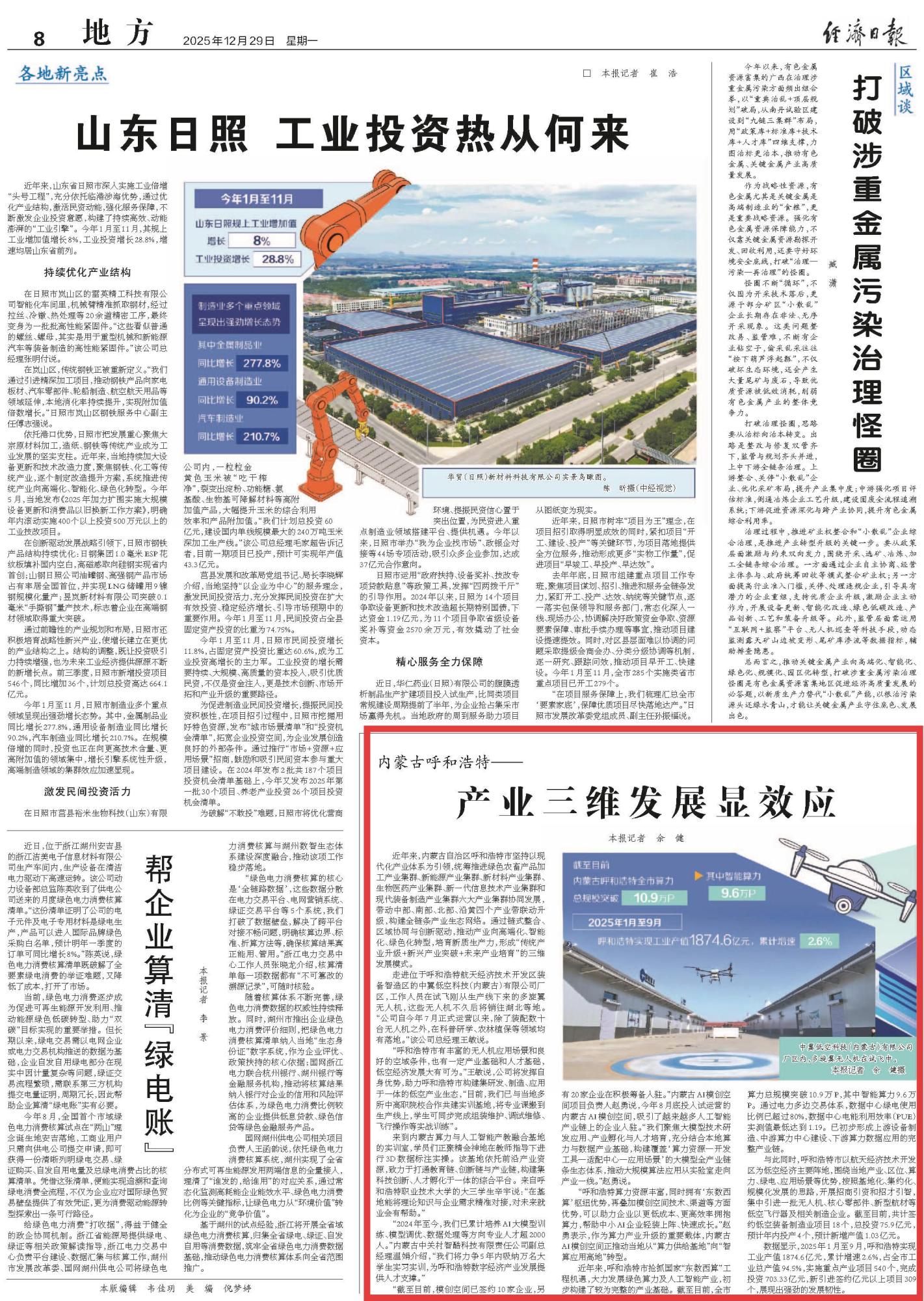 2025年12月29日,《經(jīng)濟(jì)日報》第8版刊發(fā)題為《內(nèi)蒙古呼和浩特——產(chǎn)業(yè)三維發(fā)展顯效應(yīng)》的文章,報道了內(nèi)蒙古自治區(qū)呼和浩特市堅持以現(xiàn)代化產(chǎn)業(yè)體系為引領(lǐng),通過鏈?zhǔn)秸?、區(qū)域協(xié)同與創(chuàng)新驅(qū)動,推動產(chǎn)業(yè)向高端化、智能化、綠色化轉(zhuǎn)型,培育新質(zhì)生產(chǎn)力,形成“傳統(tǒng)產(chǎn)業(yè)升級+新興產(chǎn)業(yè)突破+未來產(chǎn)業(yè)培育”的三維發(fā)展模式。