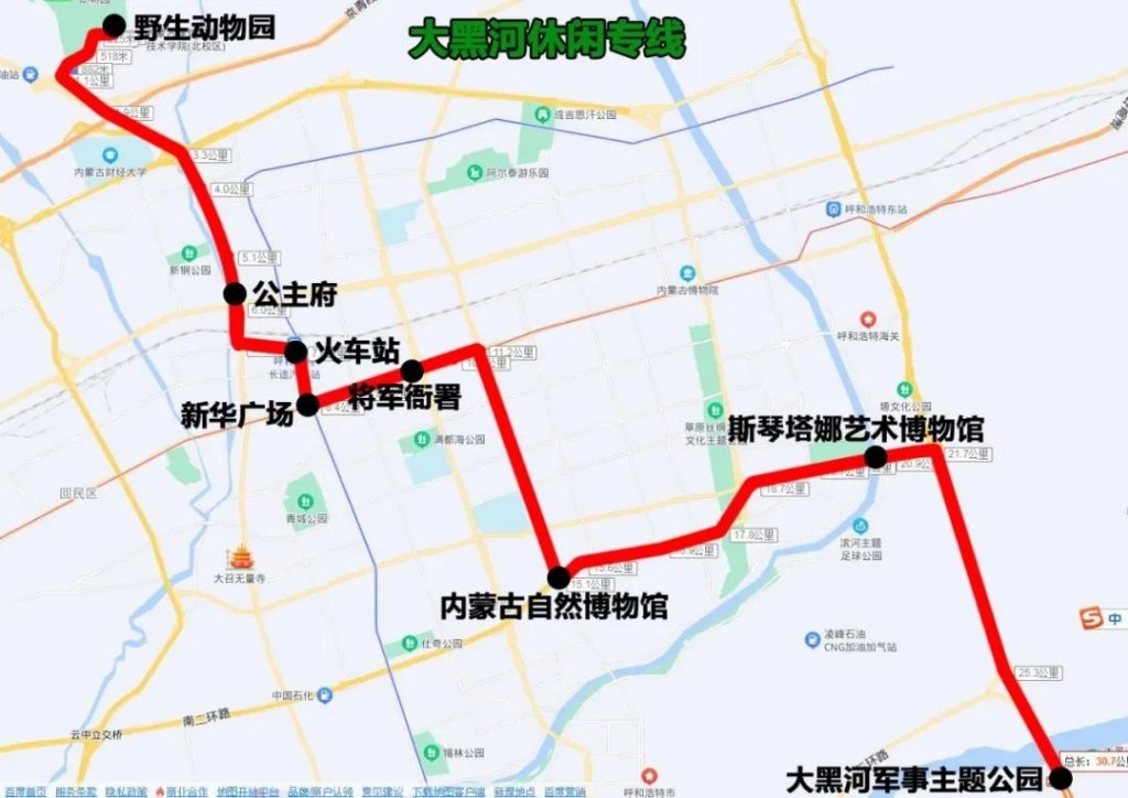 大黑河休閑專線(大青山野生動物園——大黑河軍事主題公園),途經:Y317、通道北路、車站西街、錫林北路、新華大街、興安南路、金橋路、大黑河北岸路。沿途設站:野生動物園、公主府、火車站、新華廣場、將軍衙署、內蒙古自然博物館、斯琴塔娜藝術博物館、大黑河軍事主題公園,單程:30.7公里,配車:8—10臺。
