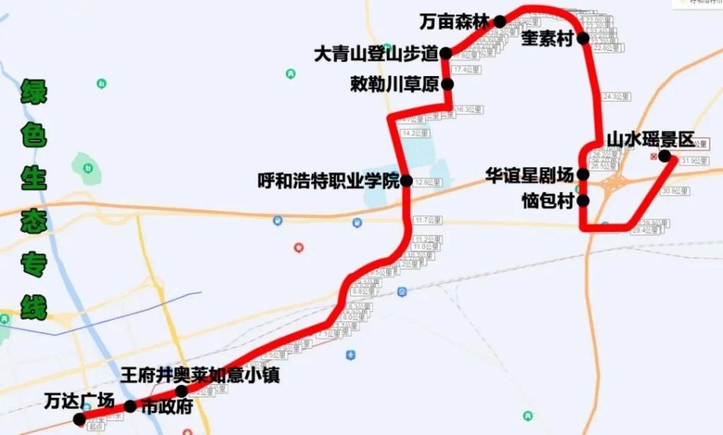 綠色生態(tài)專線(萬達廣場——山水瑤景區(qū))途經:新華東街、機場路、S101、呼和塔拉東街、野馬圖路、Y371、惱包路、110國道、S105省道。沿途設站:萬達廣場、市政府、王府井奧萊如意小鎮(zhèn)、呼和浩特職業(yè)學院、敕勒川草原、大青山登山步道、萬畝森林、奎素村、華誼星劇場、惱包村、山水謠景區(qū),單程:33公里,配車:8—10臺。
