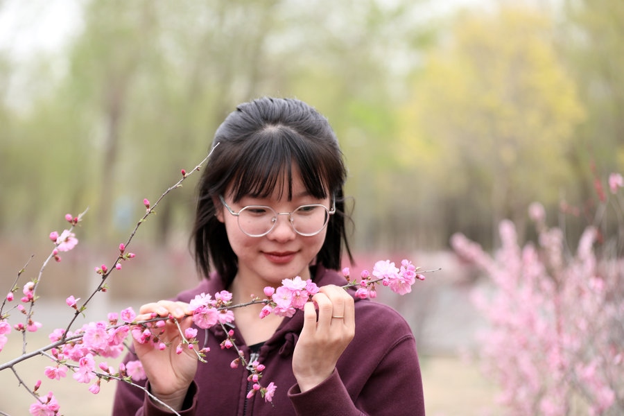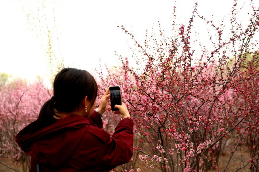 4月27日,呼和浩特南湖濕地公園的榆葉梅盛開,游客紛紛來此拍照打卡。