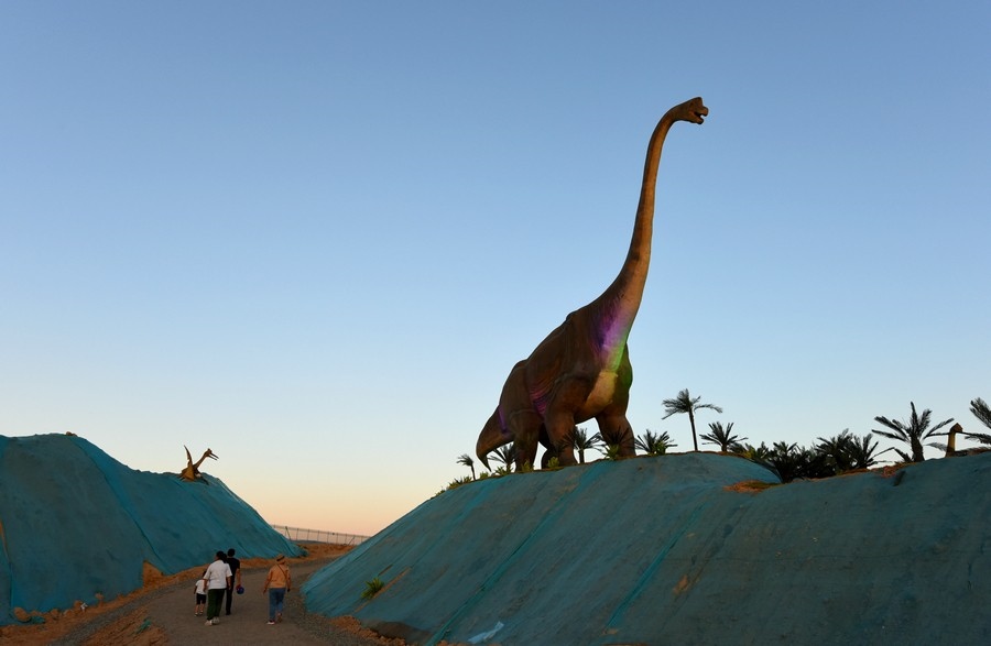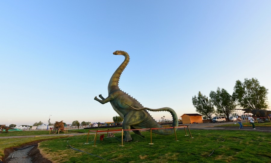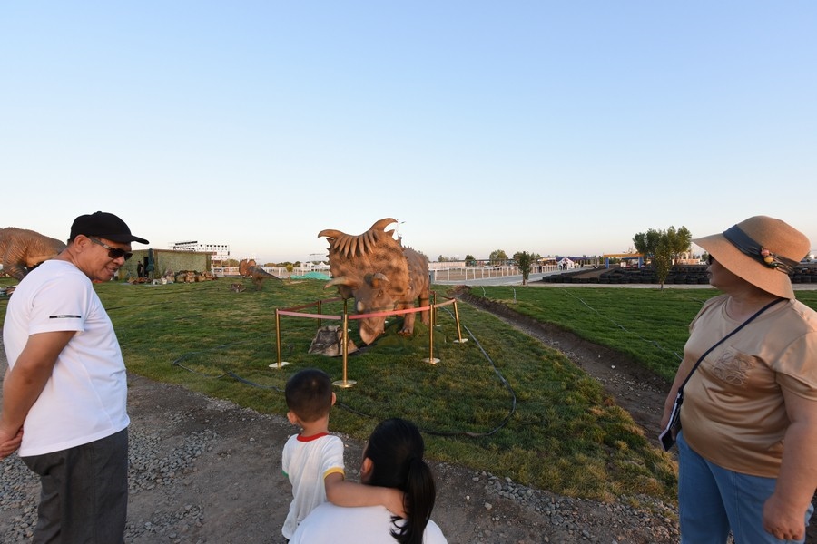 游客從高25米的亞洲最大的三條恐龍之一腳下經(jīng)過    記者 張楊攝影