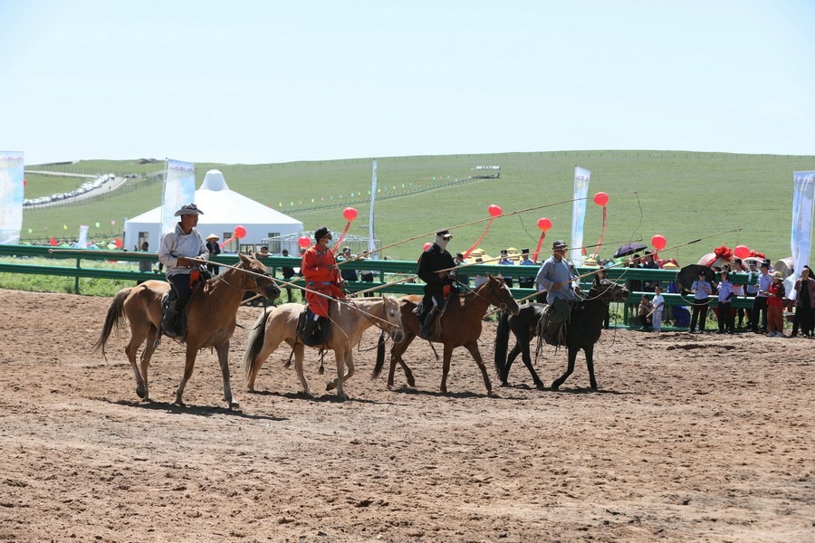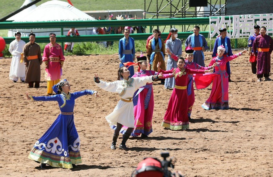 文藝演出結(jié)束后,進(jìn)行了傳統(tǒng)的那達(dá)慕賽事項目。賽馬場上群馬奔騰、塵土飛揚(yáng),場面蔚為壯觀,騎手們揚(yáng)鞭策馬,展現(xiàn)出精湛的騎術(shù),贏得觀眾陣陣歡呼。摔跤場上,搏克手你來我往互不相讓,斗智斗勇……