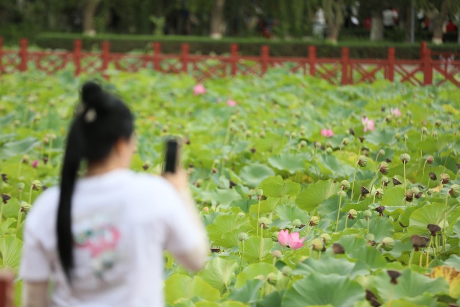 8月10日,內(nèi)蒙古烏海人民公園內(nèi)的荷花正盛放。游客在此賞荷拍照。