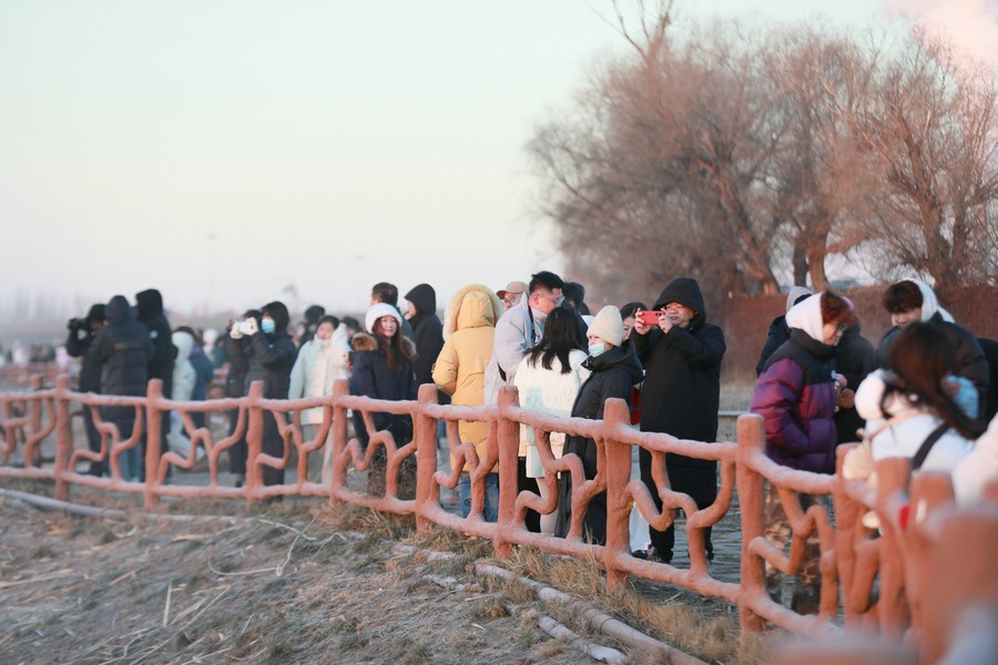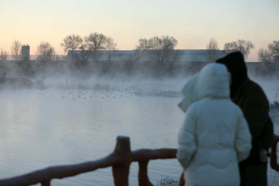 12月15日清晨,上千名游人在呼和浩特玉泉區(qū)班定營村南側(cè)的塞外“千島湖”畔賞景打卡。此處湖水為城市污水經(jīng)處理達(dá)標(biāo)后的再生水,隆冬時節(jié),再生水流入湖中,水汽蒸騰,岸邊草木霧凇皚皚,良好的生態(tài)吸引了數(shù)萬只赤麻鴨在此翔集棲息,構(gòu)成一幅生動和諧的美麗畫面。每日清晨,都有上千名游客來此觀日出賞美景。