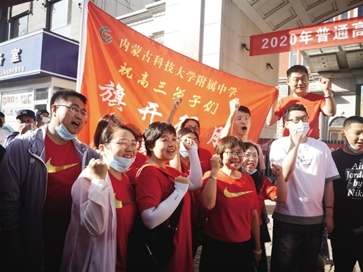 在包四中考場(chǎng),不少畢業(yè)班的老師身穿紅色T恤,前來(lái)給考生們送考,加油。