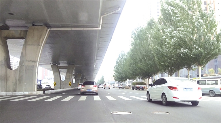 井蓋高低不平金海路高架橋下輔道很顛簸 攝影/北方新報正北方網(wǎng)首席記者 張學(xué)博