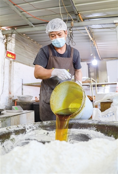 “我們堅持手工制作,就是想留住這個味道!”常三文是隆盛莊月餅制作技藝非遺傳承人,他帶記者來到了打月餅的作坊。一個約60平方米的房間里有兩個大鐵鍋,一個鐵鍋里熬著糖水,另一個鐵鍋用來和面。一名男工將面粉、熟胡麻油、糖水等按比例倒入鐵鍋,然后用鐵鏟攪拌起來。鐵鍋旁邊是一個做月餅的大案板,4個女工稱重、分劑、做胚、擺放,各自忙活著。常三文的兒子常曉峰負責(zé)將擺放好的月餅放進燒爐火的烤爐,計時、下簽子、刷油……直至月餅烤制完成出爐。