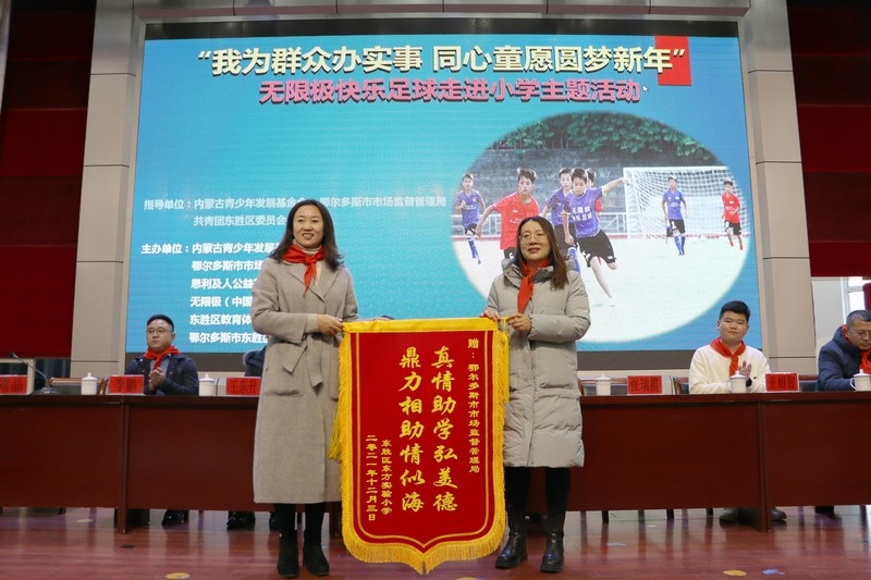 鄂爾多斯市市場監(jiān)督管理局副局長折桂蘭在公益活動上致辭,希望同學們不要單一地關注學習,而要德、智、體、美全面發(fā)展,提升綜合能力,同時用優(yōu)異的成績來回報每一個愛心人士的無私奉獻與幫助。也希望同學們分配好時間,能夠熱愛足球,熱愛自已感興趣的運動、愛好,這會讓生活更加多姿多彩,也希望同學們今后能多方面為國家貢獻自己的力量,成為各行業(yè)里的優(yōu)秀人才。