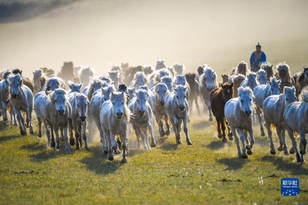 5月17日,錫林郭勒盟西烏珠穆沁旗的牧民在驅(qū)趕馬群。