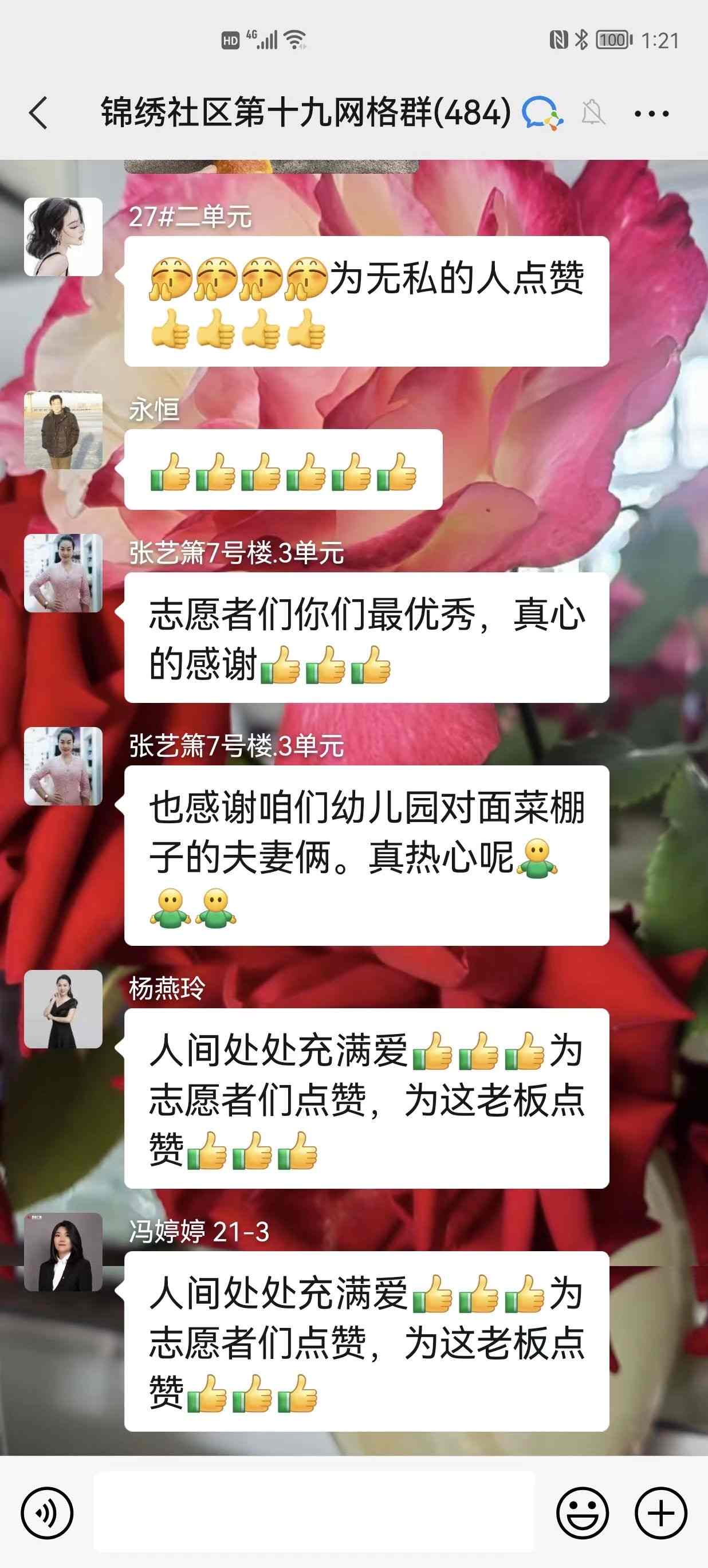 “10元、20元、30元、50元、100元……”10月28日晚,在錦繡社區(qū)第十九網(wǎng)格群,業(yè)主的捐款紛至沓來,短短4個小時籌款近萬元。原來,由于景觀花園小區(qū)物業(yè)原有的消殺工作人員肌肉拉傷,消殺速度遠(yuǎn)遠(yuǎn)達(dá)不到預(yù)期,業(yè)主楊博鵬便在群里發(fā)出組建一支消殺志愿者團(tuán)隊的倡議,號召業(yè)主們捐款購買專業(yè)消殺彌霧機(jī)和藥品。沒想到倡議得到了廣大業(yè)主的一致響應(yīng),“我報名!”“我也報名,躺著也是躺著,不如干點(diǎn)有意義的事!”網(wǎng)格群里沸騰起來,大家紛紛解囊相助,張富、斯琴吐、薛國清、崔占、史永生等15位業(yè)主還踴躍報名參加消殺志愿者團(tuán)隊。