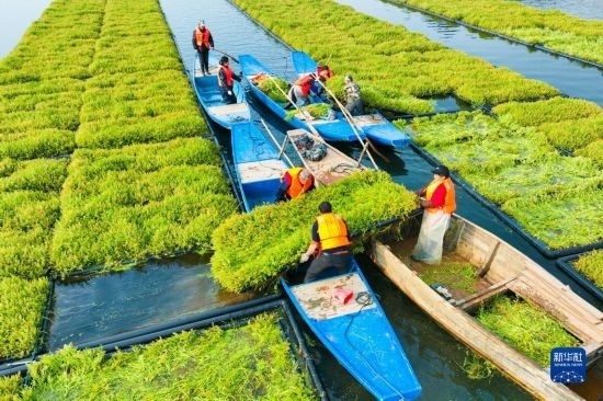 近年來,浙江省杭州市淳安縣在千島湖典型庫灣、入湖口等區(qū)域,積極運用生態(tài)浮島水上植物無土栽培技術種植空心菜、水芹菜等水生蔬菜,直接吸收庫區(qū)水體中氮磷等元素,從而能夠有效地降低水體中營養(yǎng)物質(zhì)的含量,提升水質(zhì)。近日,水生蔬菜進入采收季節(jié),“湖上菜園”呈現(xiàn)春收繁忙景象。