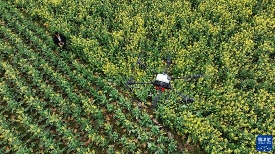 2月17日,在貴州省六盤水市六枝特區(qū)木崗鎮(zhèn)油菜基地,農(nóng)技人員利用植保無人機(jī)進(jìn)行春管(無人機(jī)照片)。