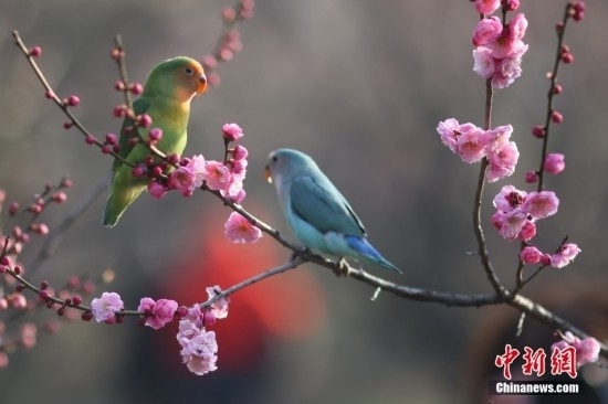 2月20日,江蘇南京,牡丹鸚鵡在梅花山梅花樹上“賞”梅。牡丹鸚鵡由南京一市民飼養(yǎng),每年在梅花盛開的時(shí)候,他都會(huì)帶著鸚鵡來到這里“賞”梅,同時(shí)也成為一景。中新社記者 泱波 攝