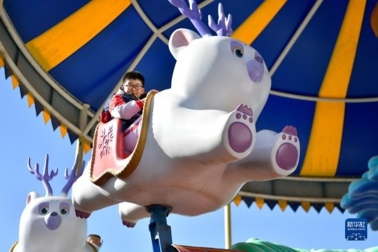 3月3日,在嘉峪關(guān)方特絲路神畫景區(qū),小游客乘坐游樂設施。