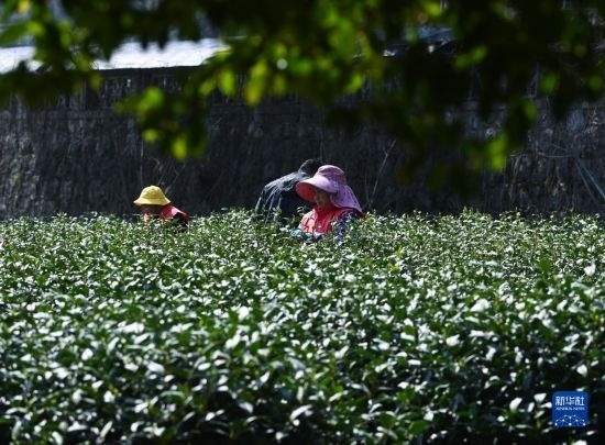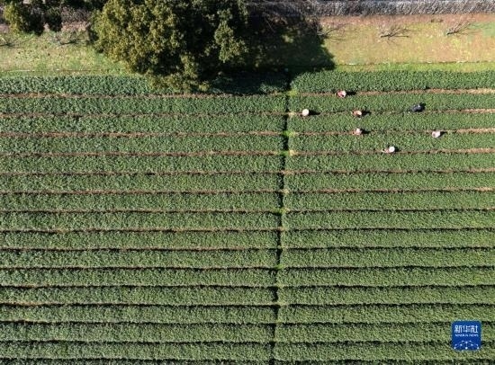 3月13日,梅家塢村的茶農(nóng)在采摘西湖龍井“明前茶”(無人機照片)。