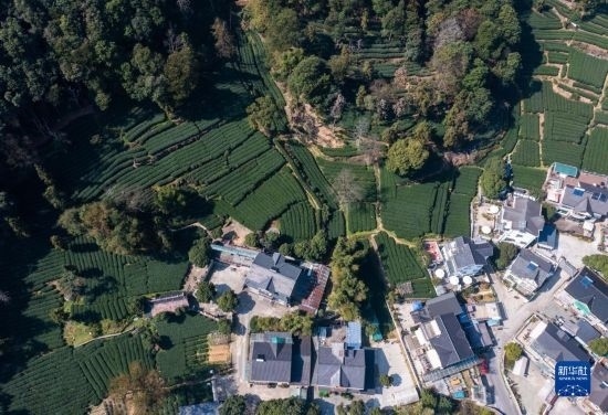 3月13日,空中俯瞰梅家塢村的西湖龍井茶地(無人機照片)。