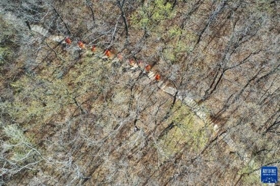 3月15日,長清區(qū)國有蓮臺山林場防火中隊隊員在林區(qū)巡護(無人機照片)。