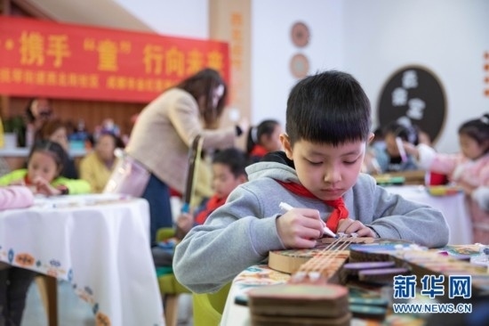 8歲的土旦卡卓是來自青海玉樹藏族自治州的藏族小朋友,她在為手中紙質(zhì)瑤琴涂畫的同時也學(xué)習(xí)著其他民族的文化風(fēng)俗。