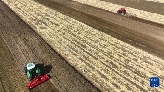 4月12日,在通遼市科爾沁左翼中旗腰林毛都鎮(zhèn),農(nóng)機在田間整地。