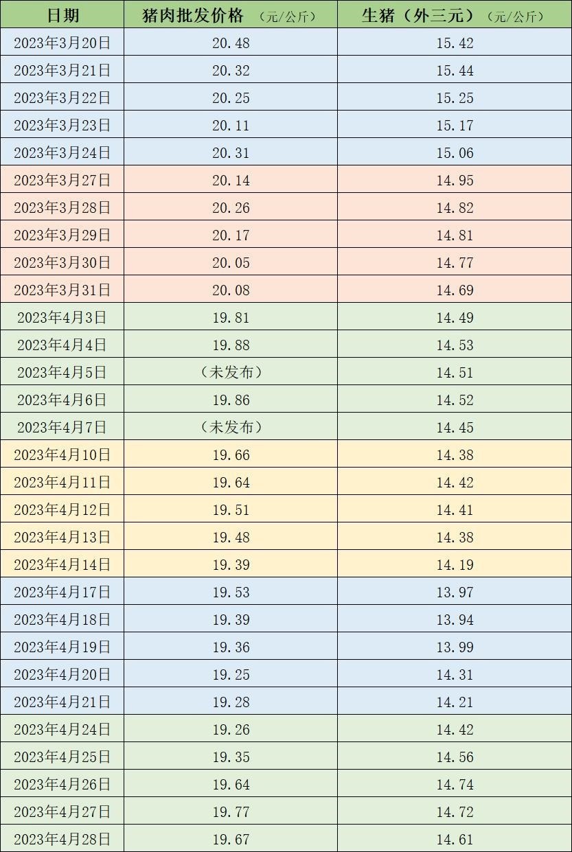 據(jù)農(nóng)業(yè)農(nóng)村部監(jiān)測(cè),4月28日,全國農(nóng)產(chǎn)品批發(fā)市場(chǎng)豬肉平均價(jià)格為19.67元/公斤,與上周五(4月21日)的19.28元/公斤相比,上漲2%。本周的平均價(jià)格為19.54元/公斤,與上周19.36元/公斤相比,上漲0.9%。