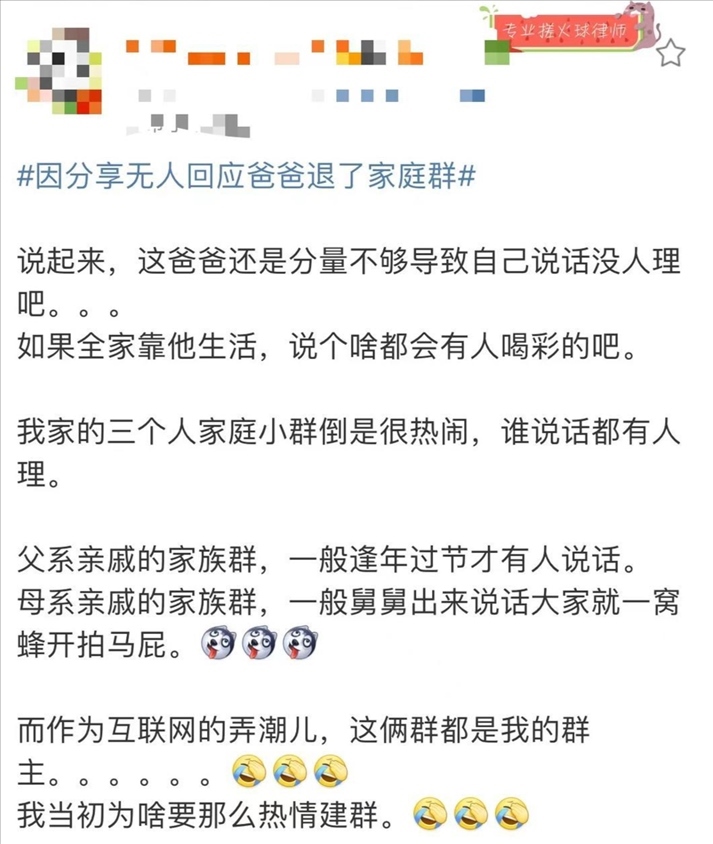 日前,一則“因分享無(wú)人回應(yīng)爸爸退了家庭群”的話題引發(fā)公眾關(guān)注,登上熱搜。