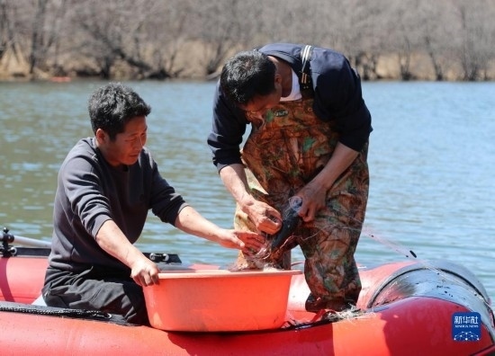 5月7日,養(yǎng)殖基地工作人員在放養(yǎng)區(qū)打撈細(xì)鱗鮭。