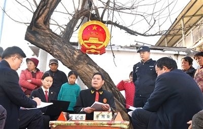 圖④:沂源法院東里人民法庭法官在中莊鎮(zhèn)河西一村現(xiàn)場開庭審理案件。(資料圖片)