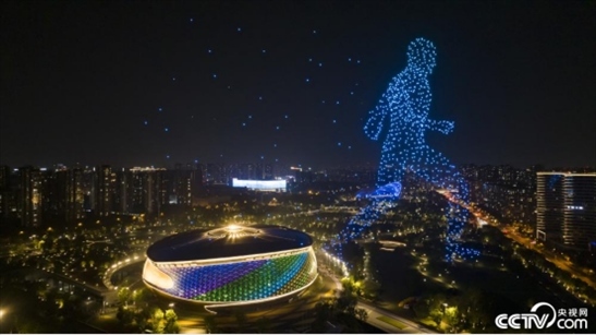 2023年5月13日,杭州亞運會乒乓球比賽場地——拱墅運河體育公園體育館上空上演無人機燈光秀表演。
