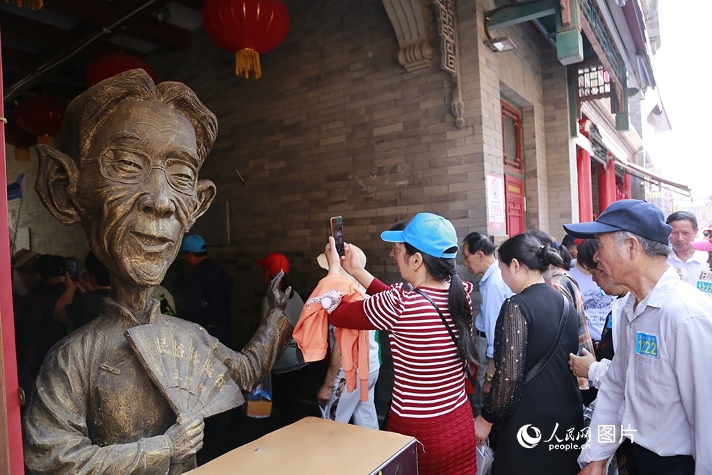 天津古文化街位于海河西岸,是國(guó)家5A級(jí)旅游景區(qū)、津門(mén)十景之一。5月16日,游客從相聲大師馬三立的雕塑旁走過(guò)。人民網(wǎng) 崔新耀攝
