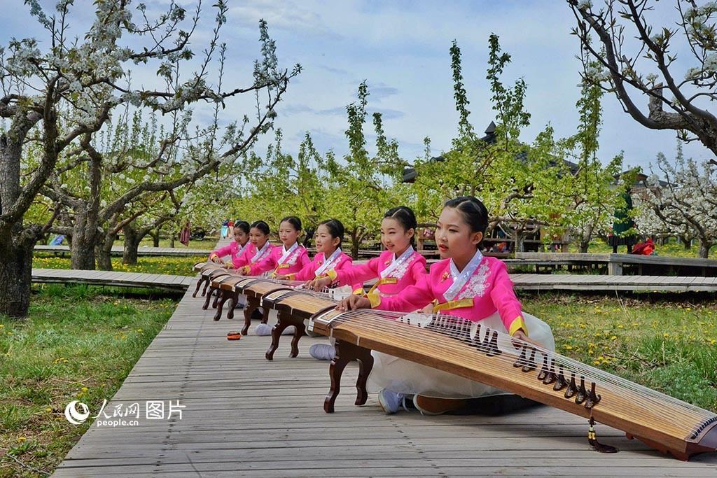 5月11日,吉林省延邊州龍井市萬(wàn)畝梨園迎來(lái)梨花盛開(kāi)期。在梨樹(shù)下孩子們彈琴賞花。人民網(wǎng) 李洋攝
